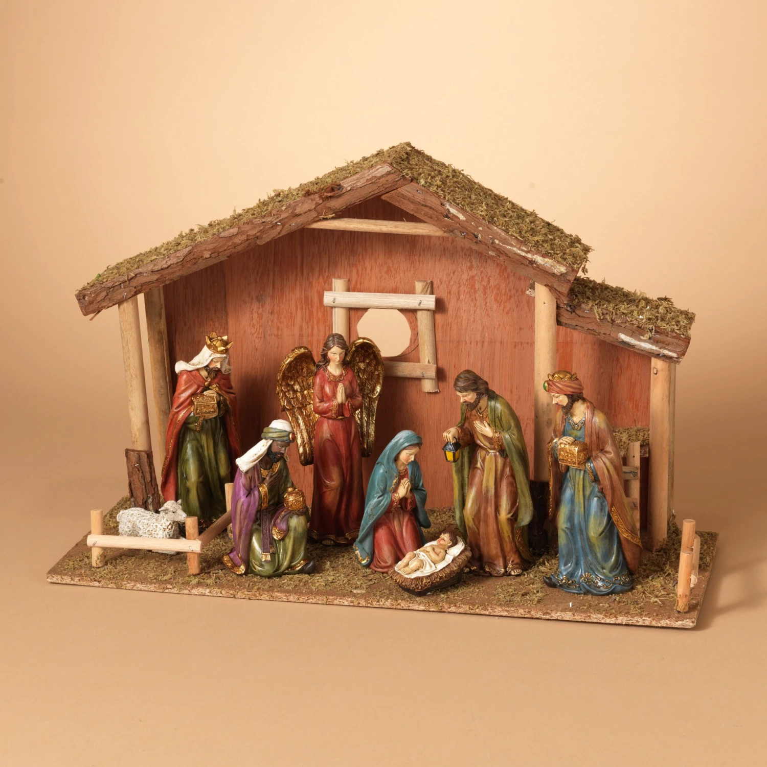 9 Piece Traditional Religious Nativity Scene with Moss Stable
