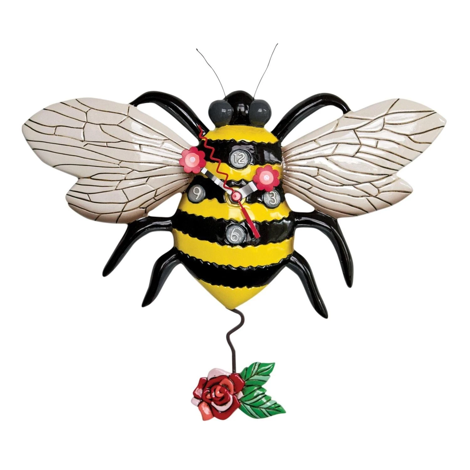 Save the bees! Buzz the honey bee is ready to pollinate flowers. The intricate detail on this insect’s wings, cute buggy eyes, and rose pendulum brings this clock to life. Full of hand-painted details that makes this a piece of art you’ll to keep forever