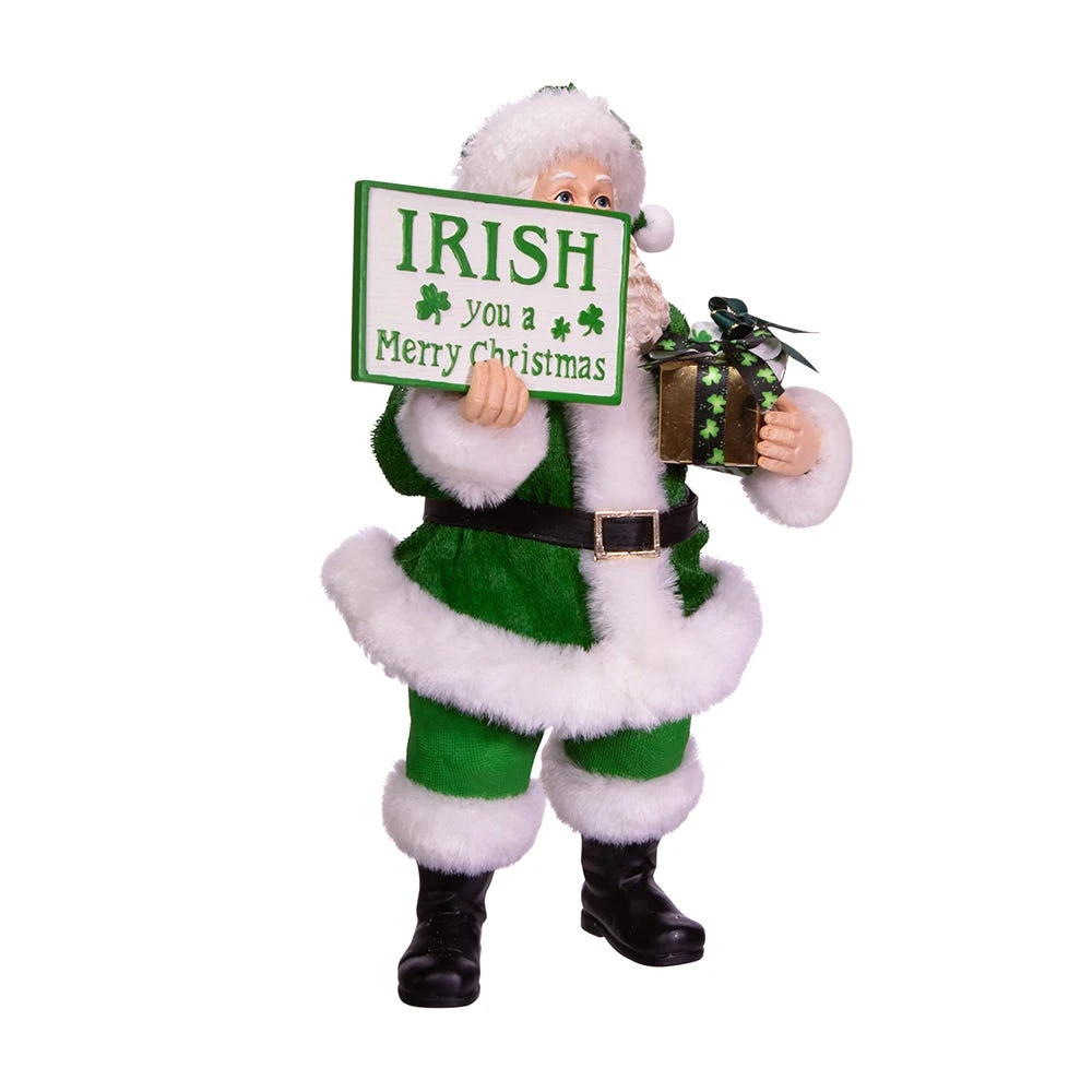 Show off your Irish heritage with this 10.5-Inch Fabriché™ Musical Irish Santa Gift Box and Sign from Kurt Adler. This Santa is wearing a green Santa suit with a shamrock on the hat. In on hand are shamrock themed wrapped presents. His other hand holds up a sign that reads “Irish you a Merry Christmas.”