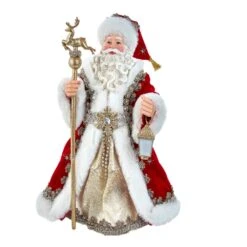 Part of the Fabriché™ collection by Kurt Adler, this 10.5-inch Regal Red Santa from Kurt Adler is a traditional and festive addition to any holiday décor. Santa Claus is featured here wearing a regal red Santa suite with black boots. He is holding a platinum reindeer staff and a lantern.