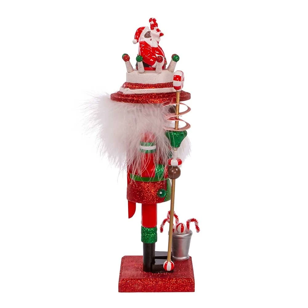 Hollywood Nutcrackers™ is a whimsical collection of nutcrackers created exclusively for Kurt S. Adler, Inc. and features an assortment of designs that put a unique, vibrant, memorable twist on traditional nutcrackers. This 10-Inch Hollywood Black Nutcracker with Santa Hat is a fun and festive addition to any holiday decor. Santa is featured wearing a red and green glittered suit with green gemstone accents. He holds a red and white peppermint candy staff and has a candy cane filled bucket at his feet. There is a miniature black Santa on top of his hat with red and green glittered accents, and he is standing on a red glittered base.