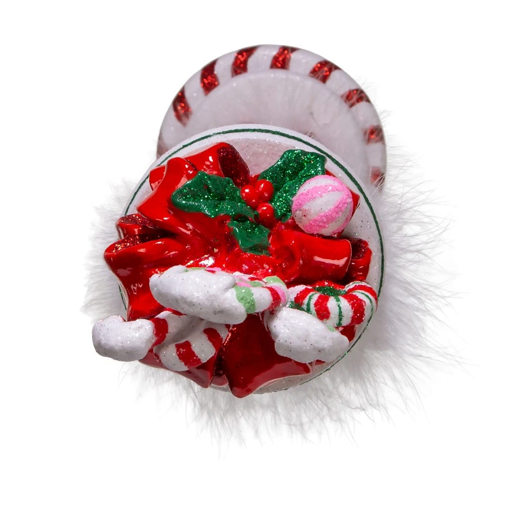 Hollywood Nutcrackersâ„¢ is a whimsical collection of nutcrackers created exclusively for Kurt S. Adler, Inc. and features an assortment of designs that put a unique, vibrant, memorable twist on traditional nutcrackers. This 12-Inch Hollywood Candy Soldier Nutcracker is a fun and festive addition to any home or holiday decor. This soldier nutcrackers is wearing a red, white and green glittered suite with feather detailing at his feet. He is holding a red and white striped ornament in one hand, and his glittered hat features assorted red, white, green glittered candy and a red glittered bow while standing on a matching white and red glittered base.