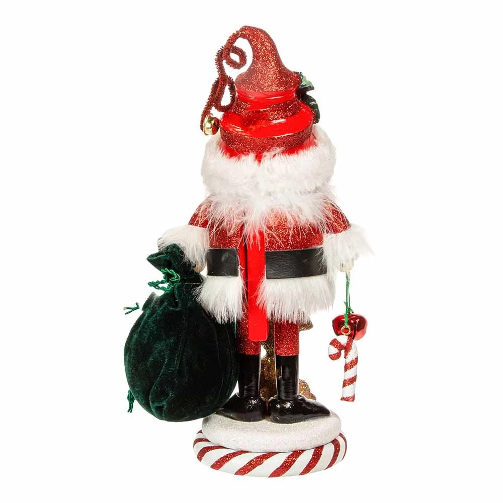 Hollywood Nutcrackers is a whimsical collection of nutcrackers created exclusively for Kurt S. Adler, Inc. and features an assortment of designs that put a unique, vibrant, memorable twist on traditional nutcrackers. This 12-Inch Hollywood Santa and Pup Nutcracker features a Santa in his glittered red and white Santa suit with a decorated Santa hat. He is carrying a green velvet sack in one hand and in the other a miniature candy cane. He is standing on a glittered red and white base with a glittered pup at his feet.