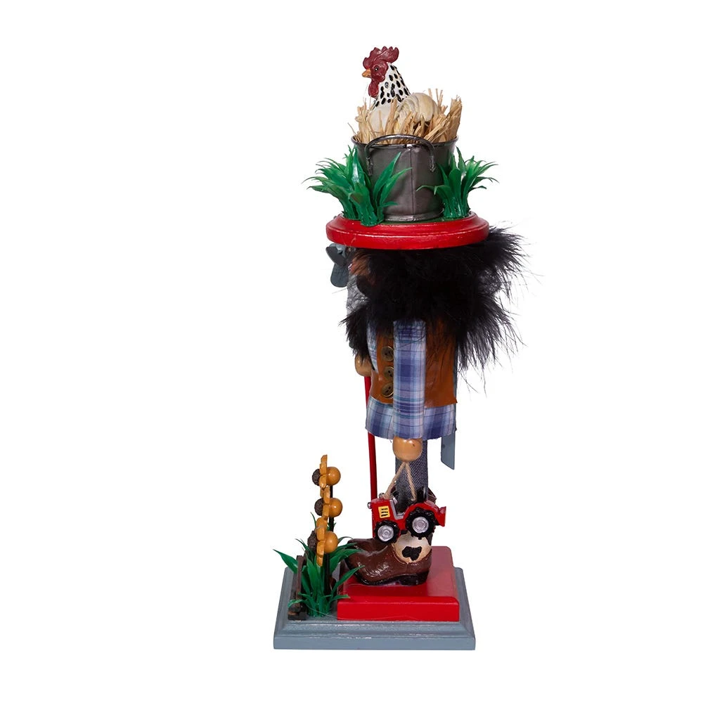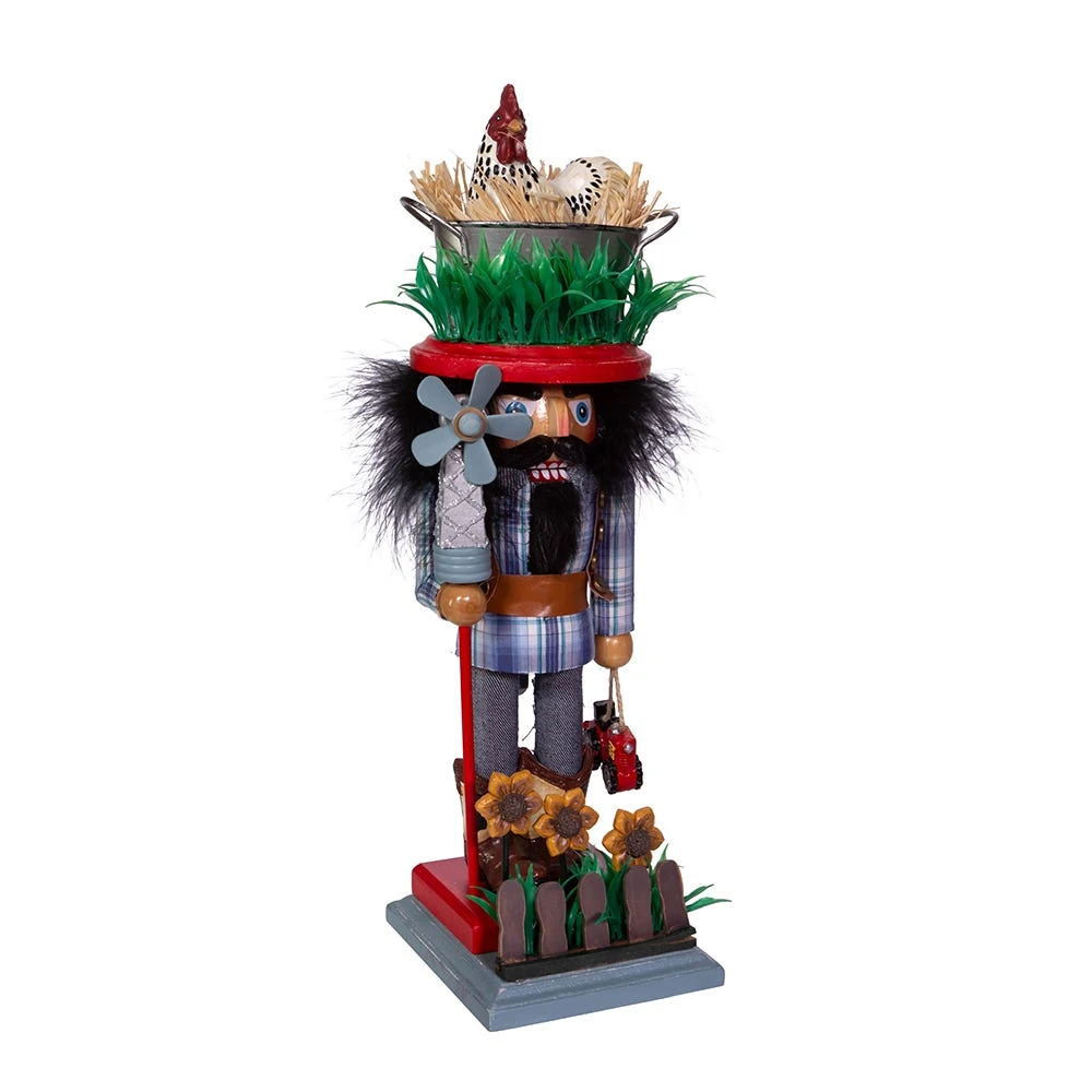 Hollywood™ Nutcrackers is a whimsical collection of nutcrackers created exclusively for Kurt S. Adler, Inc. and features an assortment of designs that put a unique, vibrant, memorable twist on traditional nutcrackers. This 15-inch Farmer Nutcracker features a rooster with grass hat, a windmill staff in one hand and a toy tractor in the other hand. The farmer is standing on a bed of grass with flowers and a picket fence.