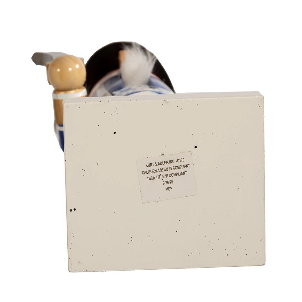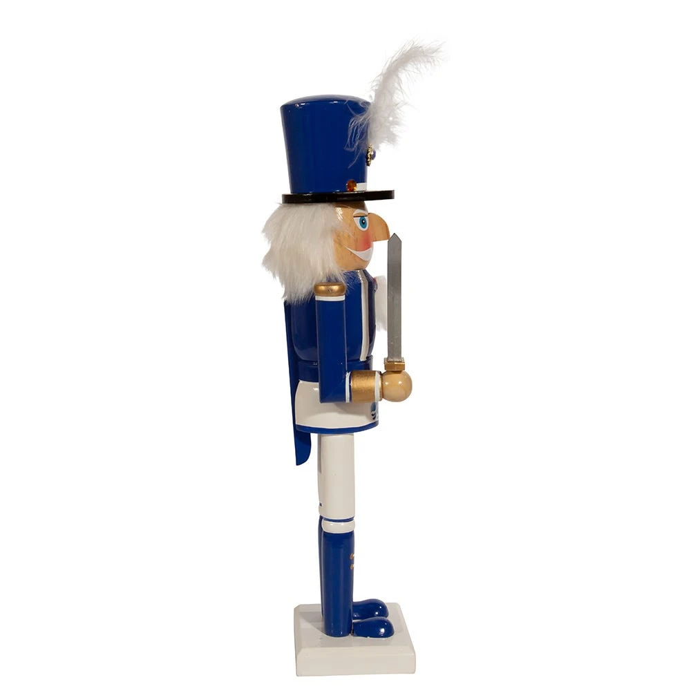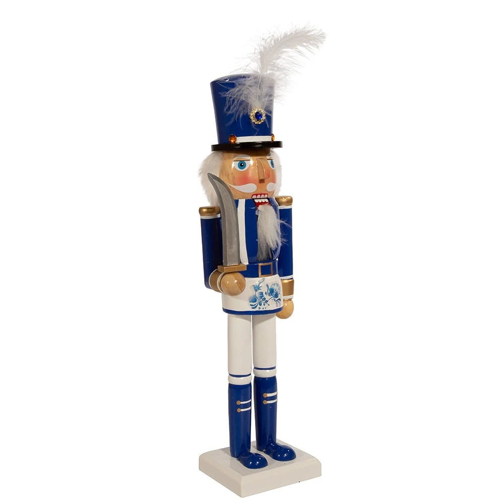 This 15-inch Wooden Delft Blue Nutcracker from Kurt Adler is a fun and unique addition to any holiday décor or nutcracker collection. The nutcracker holds a sword and has a beautiful feather on his hat. It features a blue and white color scheme with gold accents, blue gemstones and white feathers