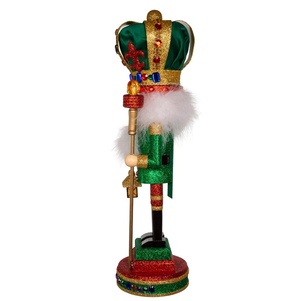 Hollywood Nutcrackers™ is a whimsical collection of nutcrackers created exclusively for Kurt S. Adler, Inc. and features an assortment of designs that put a unique, vibrant, memorable twist on traditional nutcrackers. This 16-inch Mardi Gras King Nutcracker is a fun and festive addition to any home or office holiday décor. It features a king nutcracker dressed in a red and green glittered suit decorated with amber gemstones. His crown is green with gold and red glittered design and red and blue gemstones. This beautifully crafted nutcracker is holding a glittered staff in one hand a glittered lantern in the other, standing on a matching glittered and gemstone base.