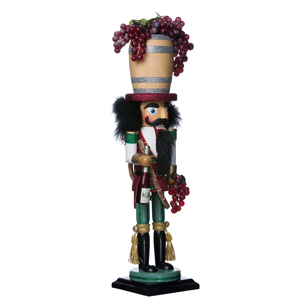 Designed by renowned artist Holly Adler, Hollywood Nutcrackers is a whimsical collection of nutcrackers created exclusively for Kurt Adler. This piece features a vineyard-inspired design, with details like grapes, a bottle of wine, and a wine barrel hat.