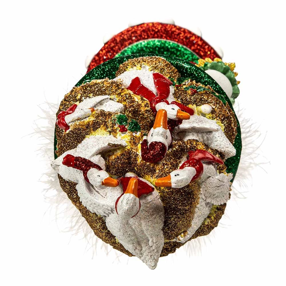 Hollywood Nutcrackers is a whimsical collection of nutcrackers created exclusively for Kurt S. Adler, Inc. and features an assortment of designs that put a unique, vibrant, memorable twist on traditional nutcrackers. This 18-inch Six Geese A Laying Nutcracker is part of the 12 Days of Chritmas collection. It features six geese atop a gold glittered nest hat with a basket of eggs in one hand and an egg topped staff in the other. The nutcracker stands on a red and green glittered base decorated with white eggs. This nutcracker is a stunning addition to any holiday décor