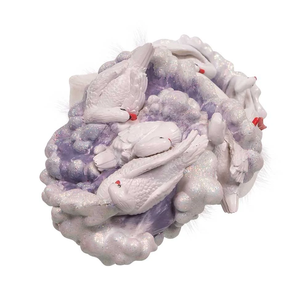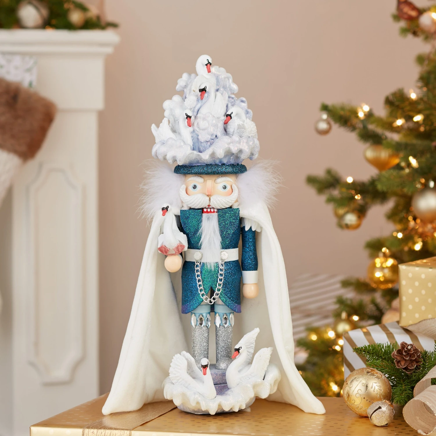 The 18-Inch Hollywood 7 Swans Swimming Nutcracker is an elaborately designed piece made for the Hollywood Nutcracker collection for Kurt S. Adler. This nutcracker features seven swans atop a blue glittered water hat. In one hand he is holding a swan and he stands on a blue glittered water base with two swans at his feet.