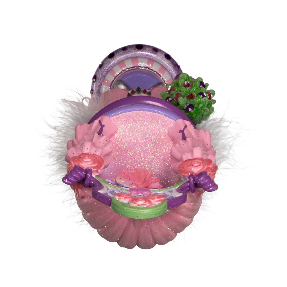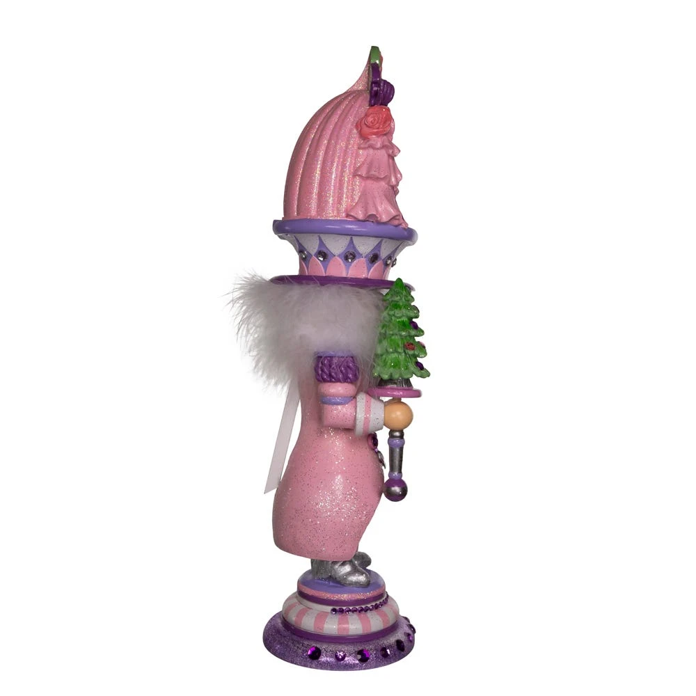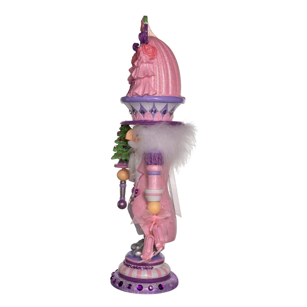 The 18-Inch Hollywood Ballet Scene Nutcracker is part of the Hollywood Nutcrackers collection at Kurt S. Adler. This nutcracker is wearing a glittered pink and silver outfit. In one hand he is holding a small, glittered and decorated tree and a pair of pink ballet slipper in the other hand. To complete the look, he is wearing a hat that shows Clara and the Nutcracker on a pink glittered stage.