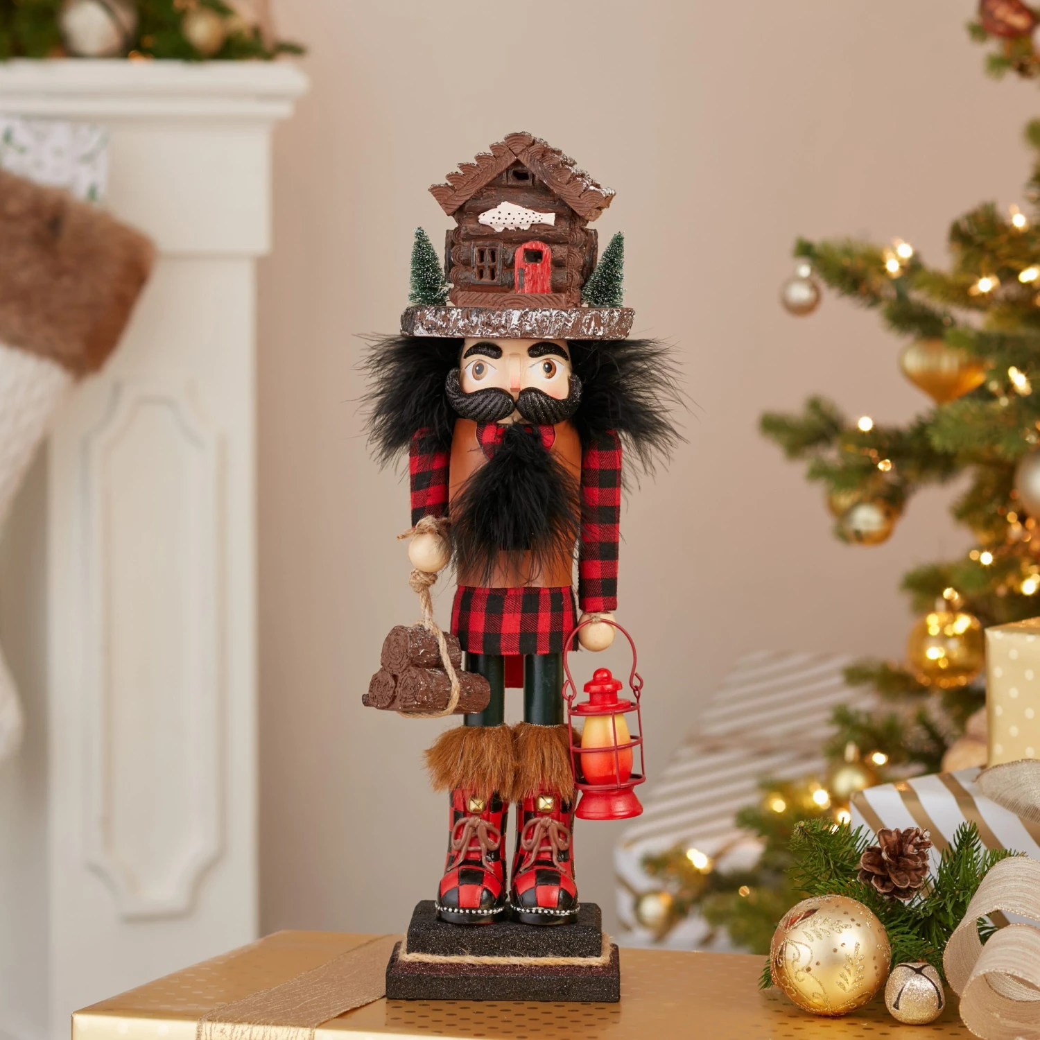 Hollywoodâ„¢ Nutcrackers is a whimsical collection of nutcrackers created exclusively for Kurt S. Adler, Inc. and features an assortment of designs that put a unique, vibrant, memorable twist on traditional nutcrackers. This 18-Inch Hollywoodâ„¢ Lodge Nutcracker with Cabin Hat is living his best lodge life. He is wearing a red and black plaid outfit from his shirt to his boots. This nutcracker features a lodge hat and is holding a lantern in his left hand and sack of logs in his right.