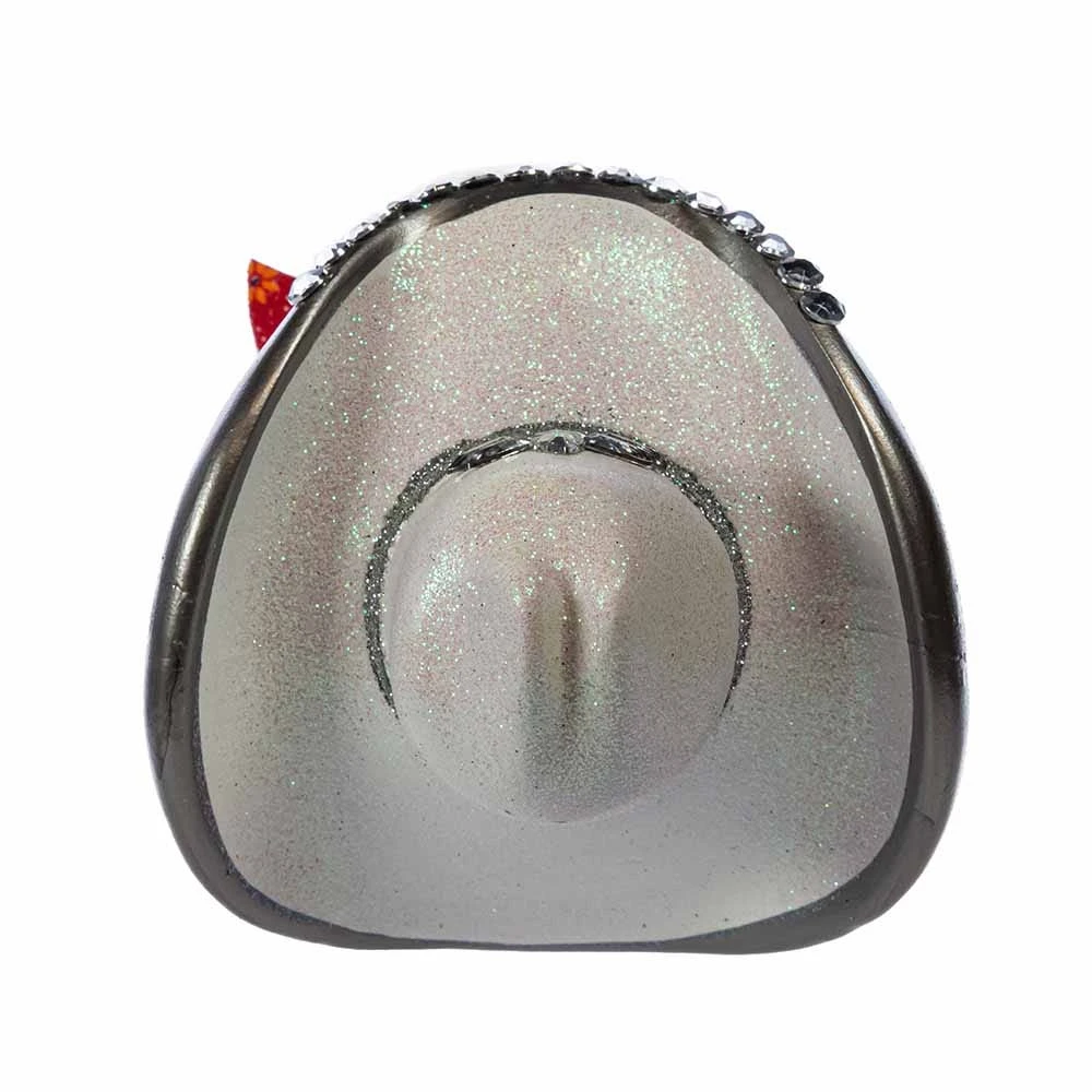 Hollywood Nutcrackers is a whimsical collection of nutcrackers created exclusively for Kurt S. Adler, Inc. and features an assortment of designs that put a unique, vibrant, memorable twist on traditional nutcrackers. This 18-Inch Hollywood Rhinestone Cowgirl Nutcracker features a cowgirl wearing a white western inspired outfit with silver boots, a red bandana and a white and silver glittered cowgirl hat. Her outfit is decorated with clear gemstones and she holds a lasso in her right hand.