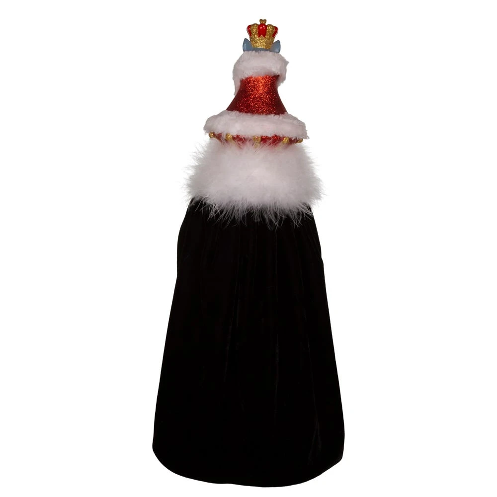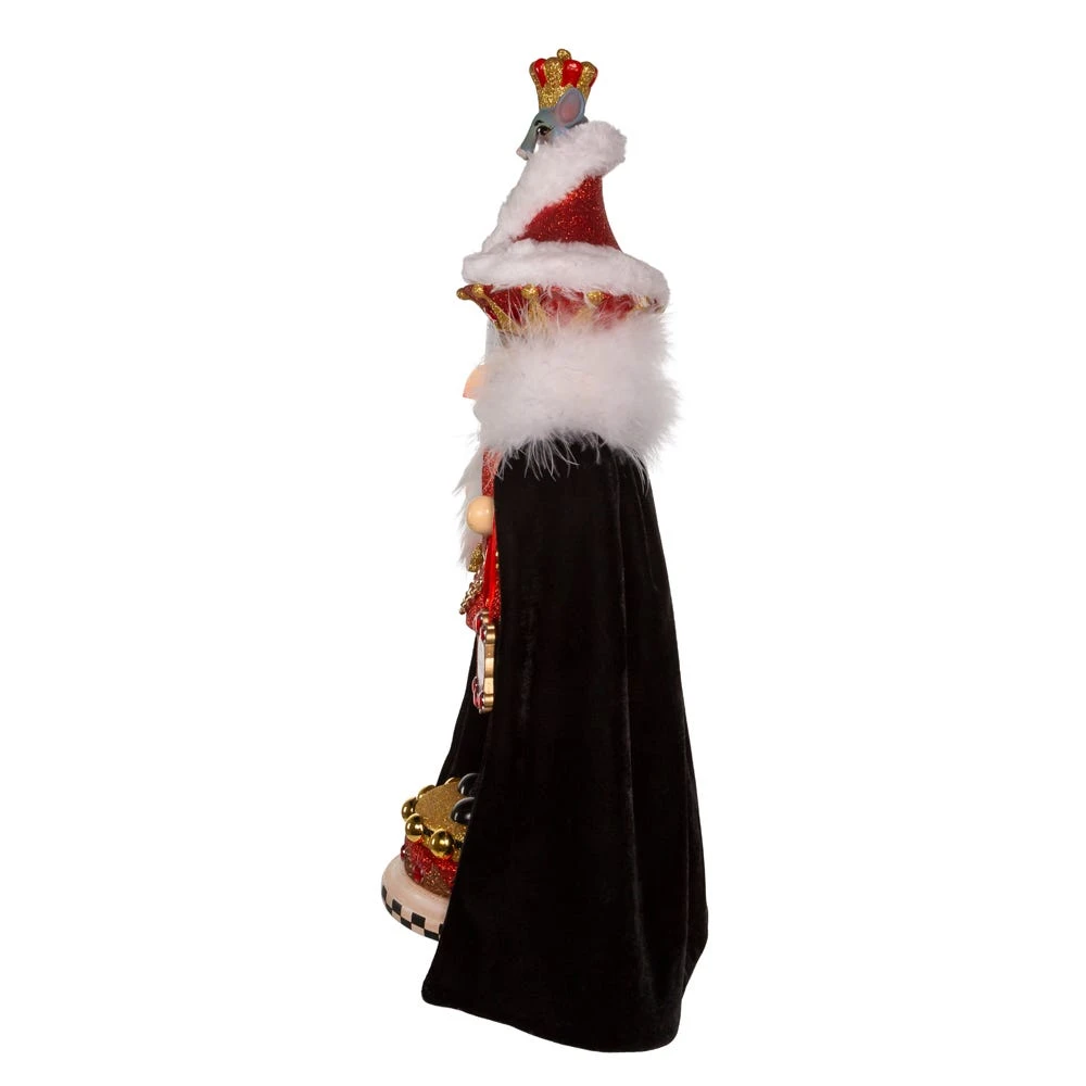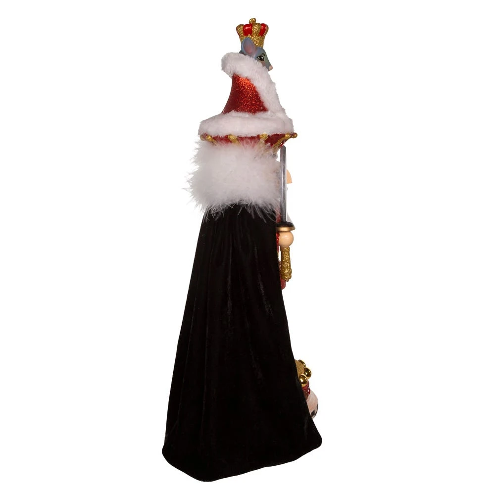 The 18-Inch Hollywood Suite Mouse King is a part of the Hollywood Nutcracker collection. This traditional Mouse King is dressed in a red and black glittered suit with a matching black cape and gemstone accents. In one hand he holds a glittered sword and in the other a red jeweled “The Nutcracker” sign. A mouse with a red cape and glittered hat sits atop his red and gold glittered hat, and he stands on a glittered base with red and gold gemstone detailing.
