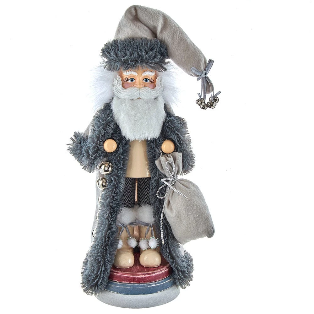 Hollywood Nutcrackers is a whimsical collection of nutcrackers created exclusively for Kurt S. Adler, Inc. and features an assortment of designs that put a unique, vibrant, memorable twist on traditional nutcrackers. This 18-Inch Hollywood White and Gray Santa Nutcracker is in a white and gray outfit with matching gray hat and tasseled boots. This expertly crafted nutcracker holds a gift sack in his left hand and has silver bell accents.