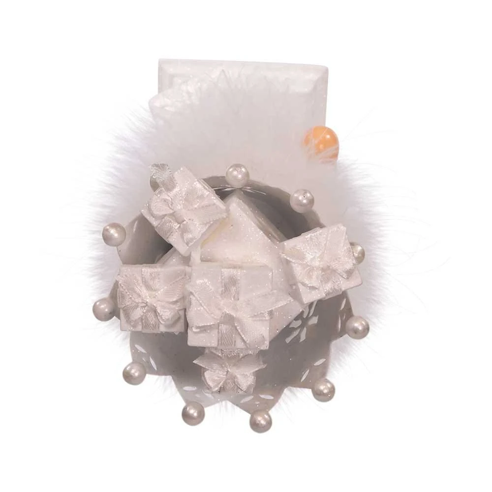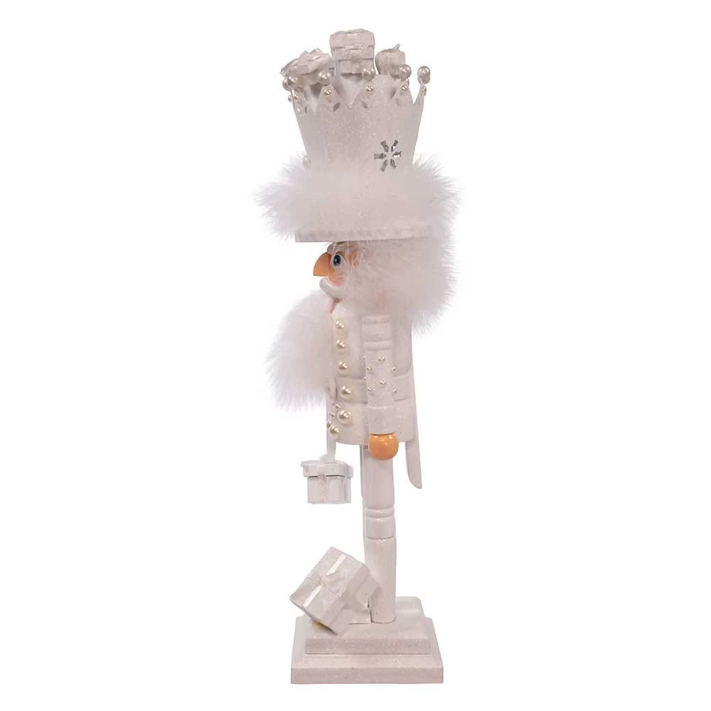 The 18-Inch Hollywood White King Nutcracker with Gifts is a beautiful addition to the Hollywood Nutcracker collection for Kurt S. Adler. This king nutcracker is wearing an all white glittered suit with white pearl accents. He is holding a white gift in his right hand, with a white gift at his feet. He has a matching white glittered and white pearl accented hat with glittered presents and is standing on a matching white glittered base.