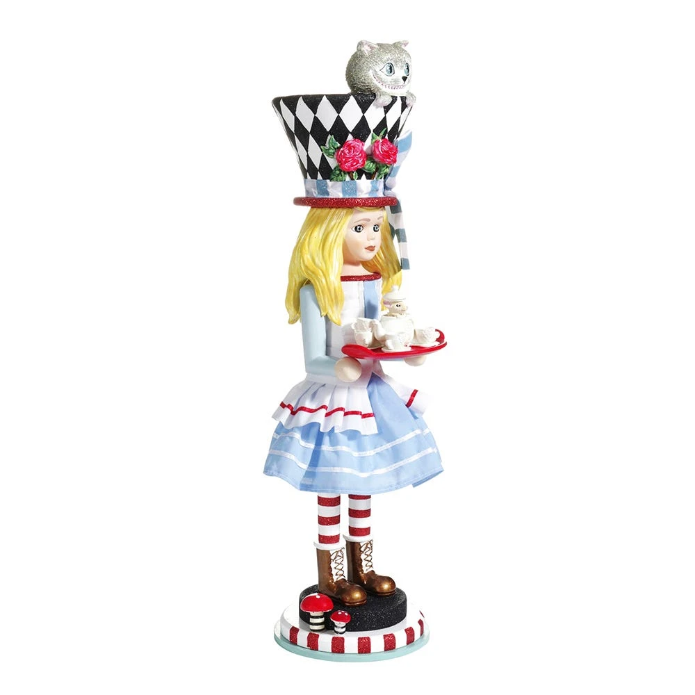 Hollywood™ Nutcrackers is a whimsical collection of nutcrackers created exclusively for Kurt S. Adler, Inc. and features an assortment of designs that put a unique, vibrant, memorable twist on traditional nutcrackers. This 19.5-Inch Alice Nutcracker is inspired by Lewis Carroll’s 1865 novel Alice’s Adventures in Wonderland. Alice is featured here with a tea set and topped off with a black-and-white diamond patterned top hat. Cheshire cat is peeking out of the hat. This nutcracker is a stunning addition to any holiday décor.