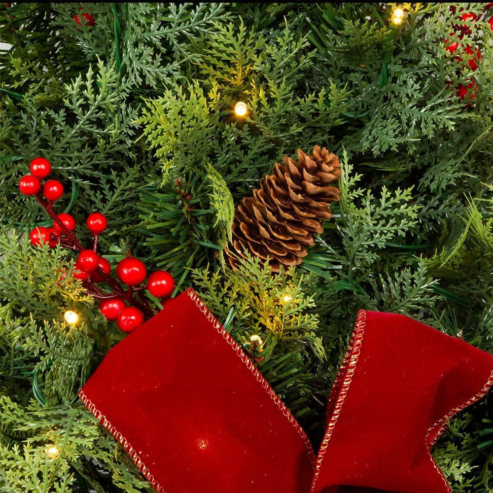 The 26-Inch Battery-Operated Pre-Lit Wall Tree With Red Bow is made of cedar, berries, and pinecones. It comes with a red bow highlighting the holiday spirit and 30 battery-operated led lights. This is perfect for that touch of Christmas in any part of the house. The lights are powered by 3 AA batteries which are not included.
