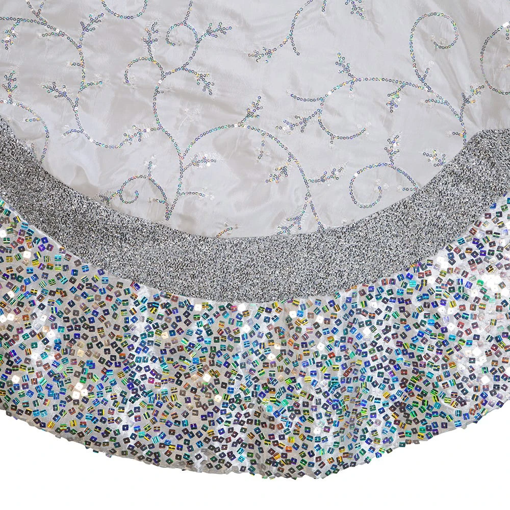 This 60″ Silver Treeskirt from Kurt Adler is a beautiful, festive way to add to the dĂ©cor of your Christmas tree. Its large 60″ design has a scalloped edge and features silver sequins and embroidery for an extra festive touch, and the size is perfect for larger trees or for adding drama to any tree size.