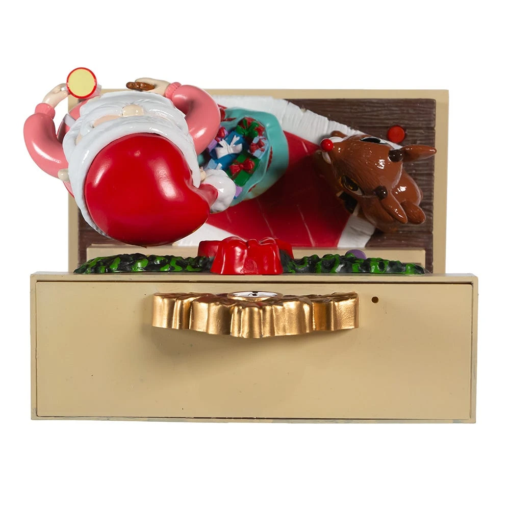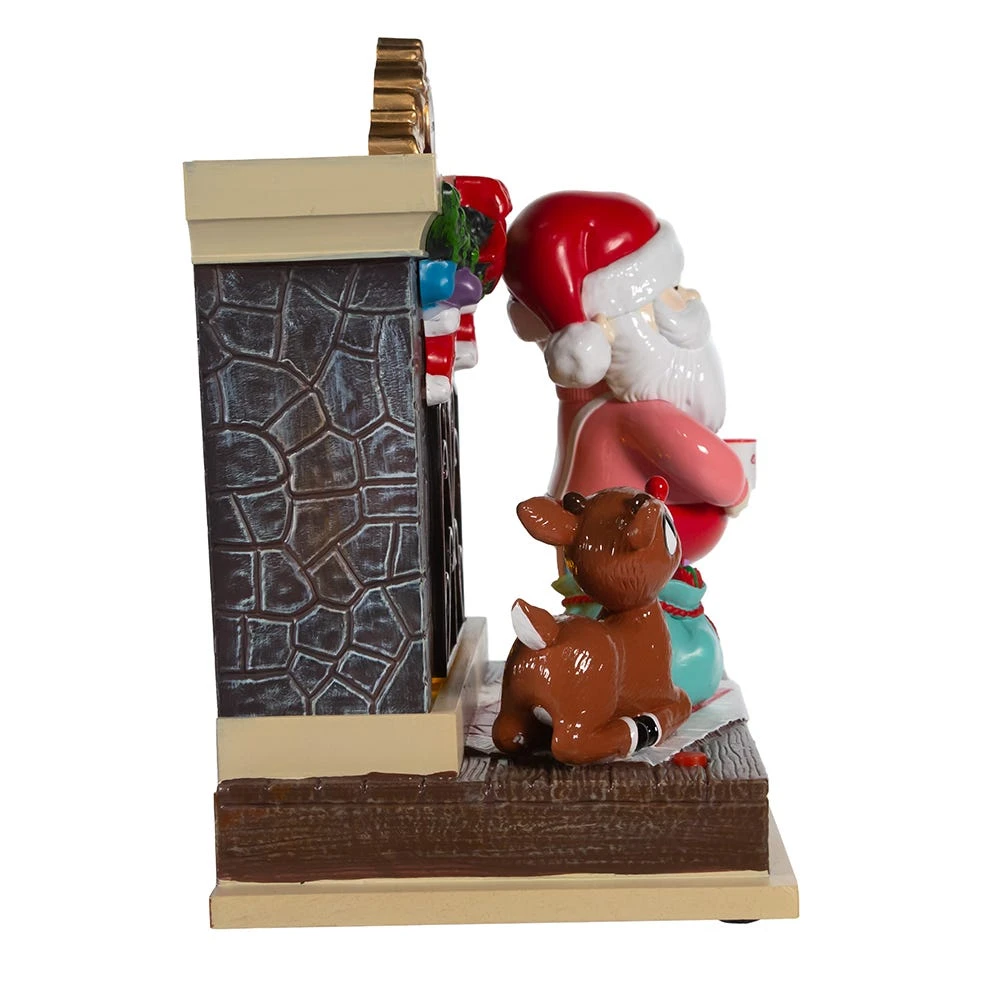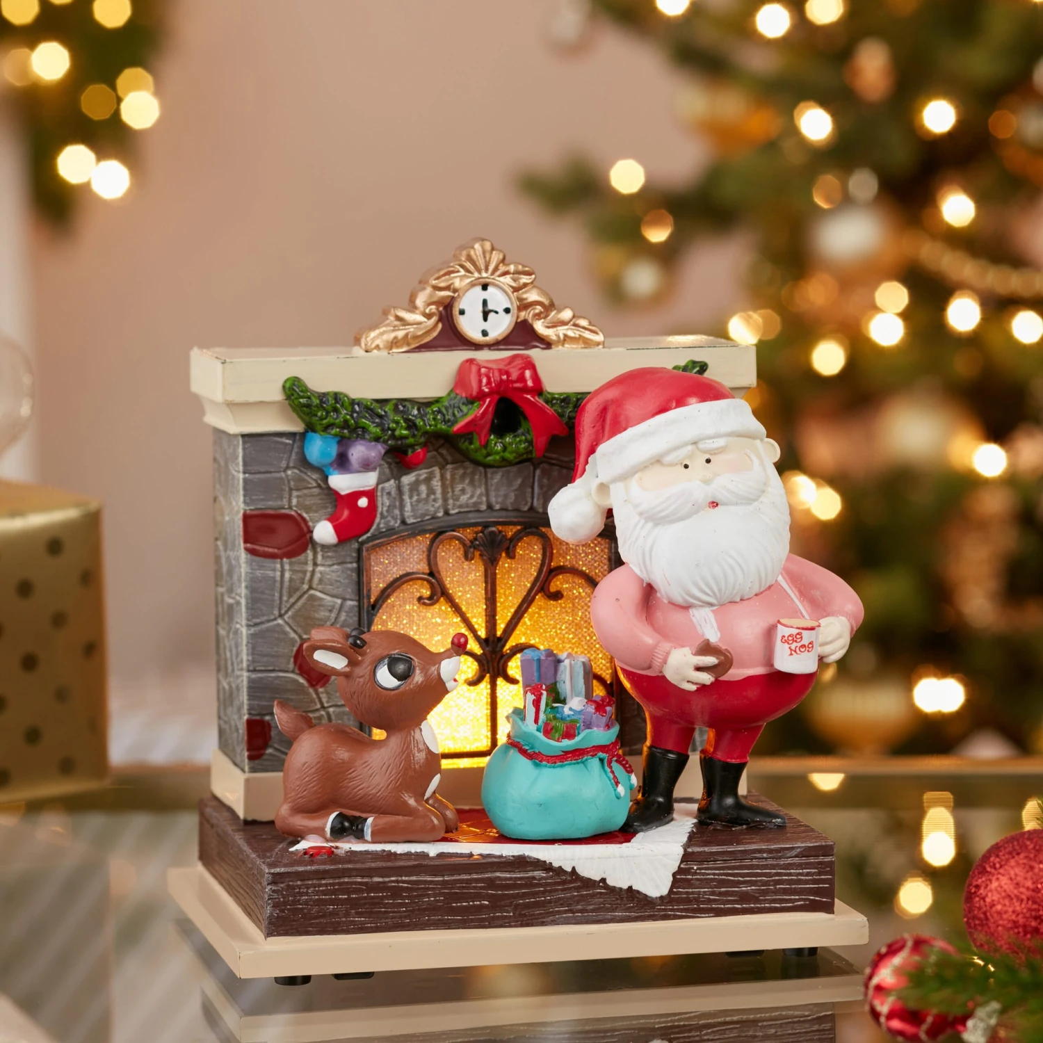 This 7-Inch Battery-Operated Rudolph and Santa Fireplace Table Piece from Kurt Adler is a festive addition to any home or office holiday décor. It features a fireplace setting with a decorated mantle. Santa is drinking egg nog and eating his cookies while Rudolph relaxes in front of the fire. This item requires 3 AA batteries (not included).