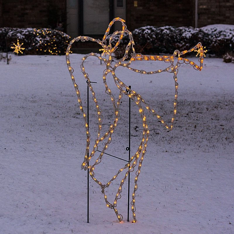 This ornament produces the image of an angel facing right, sounding off on a trumpet. The LED Angel Warm White (Right Facing) is 58 x 39 inches in size and features 200 powerful LED lights. Most of these lights are warm white in color; the lights representing the angel’s trumpet and halo are yellowish. It is designed for both indoor and outdoor display. There is a similar product, in which the angel faces left.