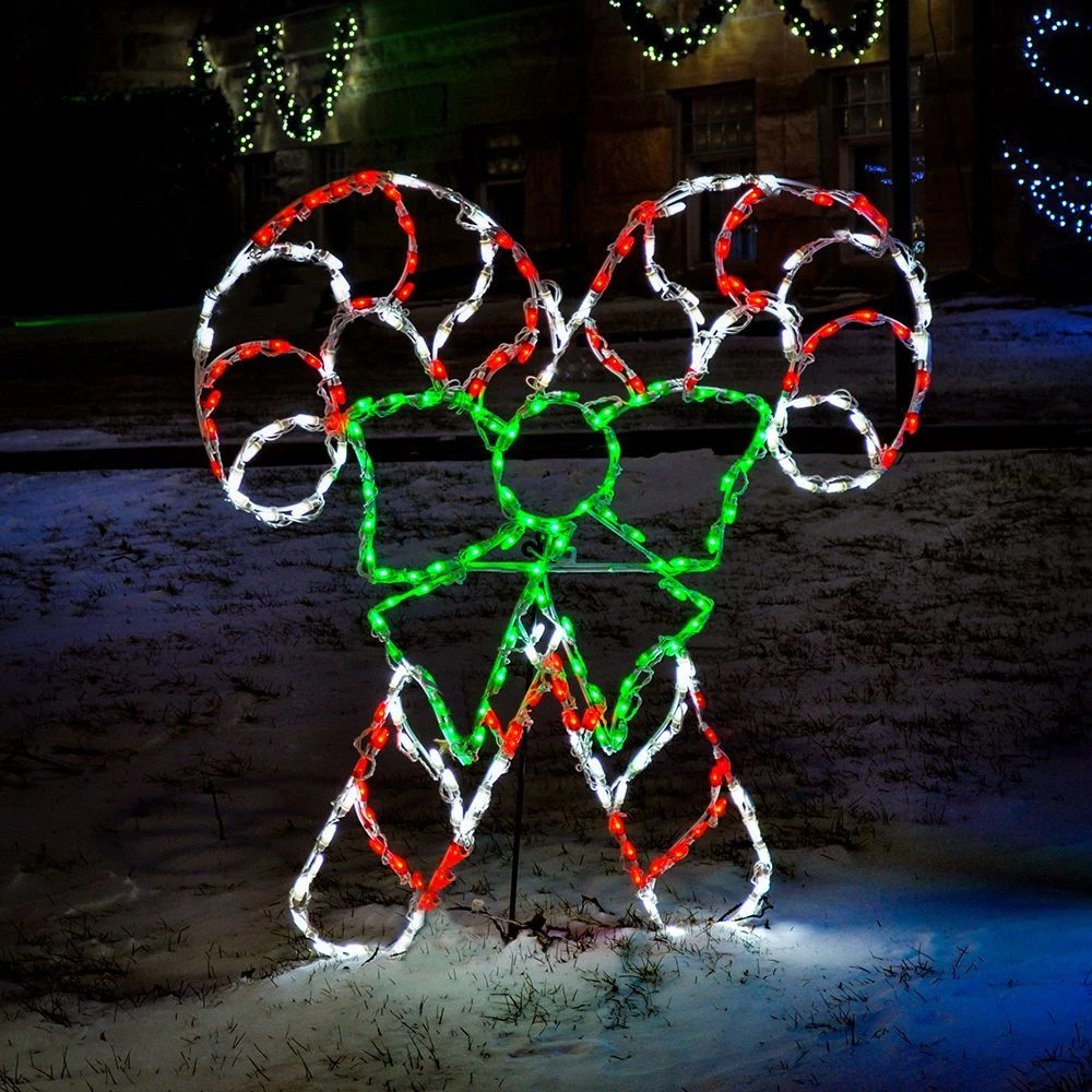 If you want to create a candy-themed Christmas display set, use this LED Double Candy Canes with bow ornament, which is available here at Brite Ideas! With its rigid steel frame and collection of 260 LED light bulbs, the ornament creates a nifty-looking visual display piece coated with powerful LED light bulbs. The rust-resistant, powder-coated steel frame creates the shape of two candy canes crossed like swords and tied together thanks to a large green bow.