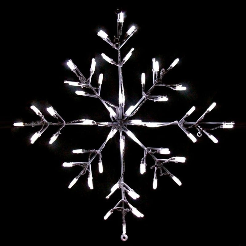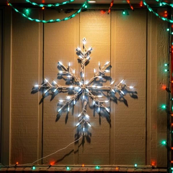 This edition of our LED Snowflake production line is 30 x 30 inches in size. Its design scheme is simplistic but efficient: four intersecting shafts of steel, both tips of each shaft adorned with two V-shaped prongs. The whole ornament is wrapped with electrical wiring and visually enhanced with a system of 100 miniature LED light bulbs. This ornament works for both indoor and outdoor