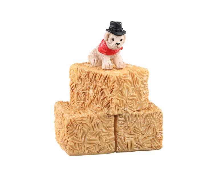Farm “Animals” is a bale of fun. This Christmas village accessory features a bulldog puppy wearing a cowboy hat and a handkerchief sitting on top of a bale of hay. It’s a great addition to any western-themed Christmas village.