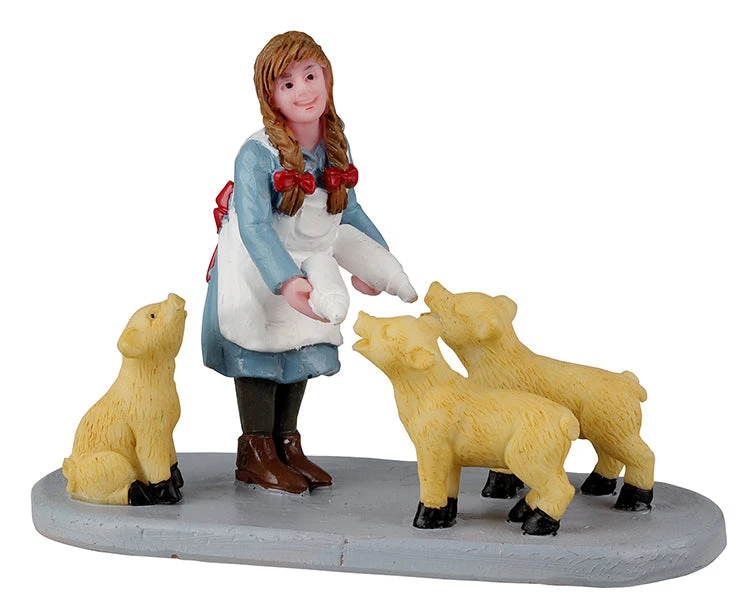 Caddington Village is home to more than just human residents! Just ask this little village girl, who is responsible for feeding three hungry piglets! With milk bottles in hand, she is ready to give them what they need, and they certainly look happy to see her!