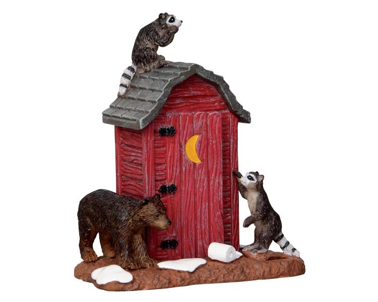 Two raccoons and a bear attack an outhouse. Great accessory for your spooky town village! Combine with any other outdoor village piece to complete a spooky outdoor scene