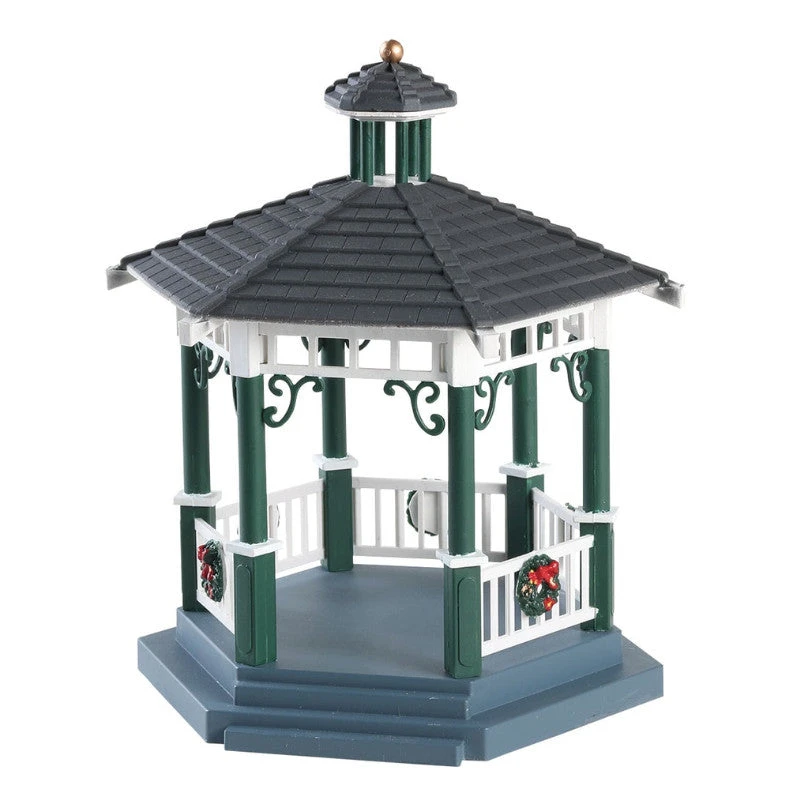 The Victorian Park Gazebo is ready for Christmas with pine wreaths and red bows.