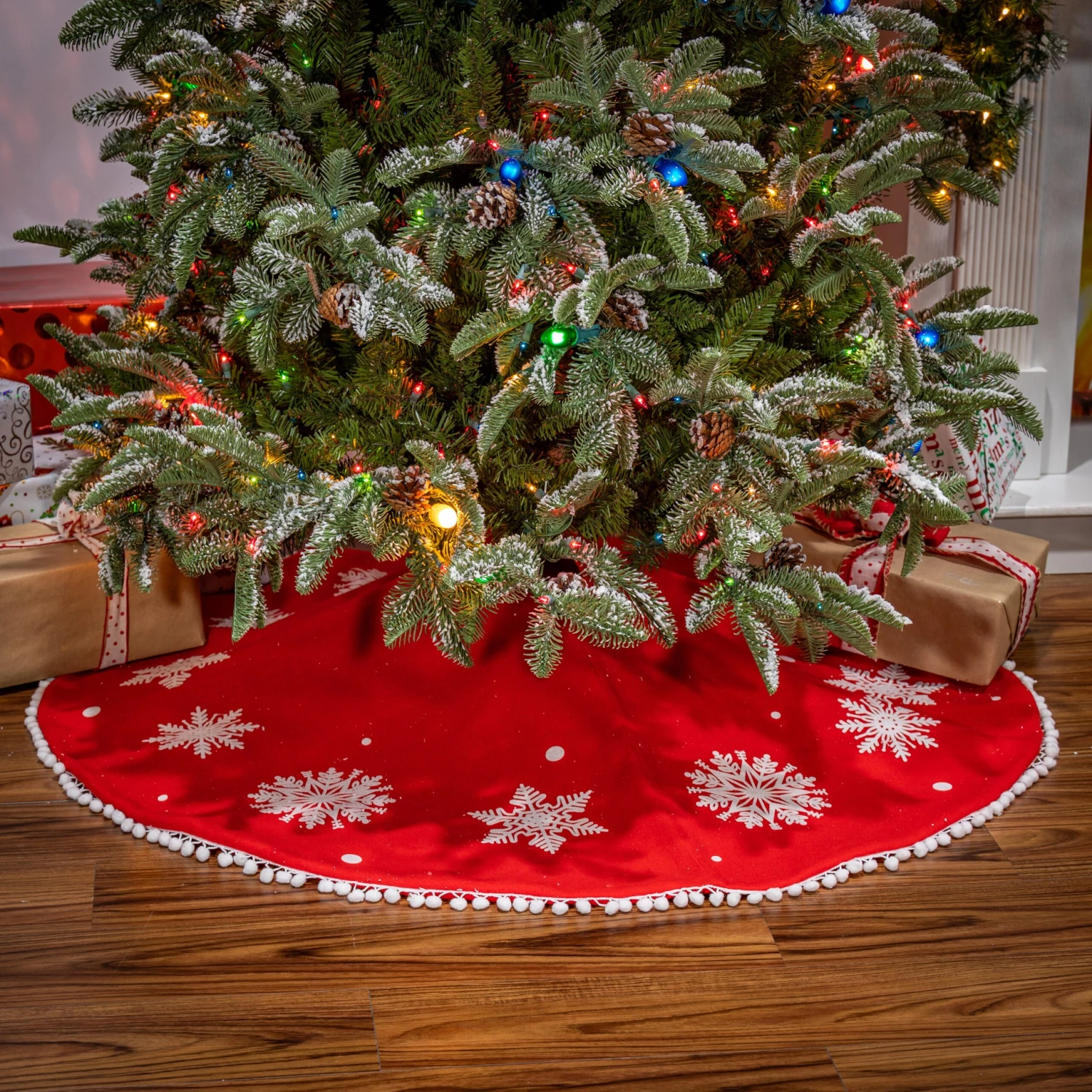 Red and White Snowflake Christmas Pompoms Tree Skirt, Velvet