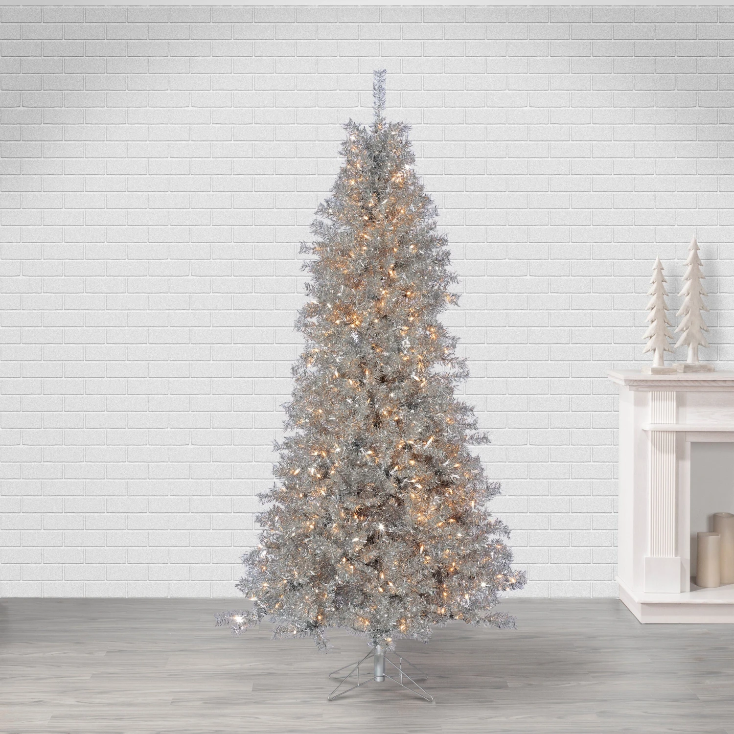 Your holiday home will sparkle and dazzle like no Christmas before with the absolutely stunning pre lit Silver Curly Tinsel Tree! Easy to assemble and towering at 7.5 feet in height with a 48 inch base width, this centerpiece comes with 550 incandescent lights that gives your holiday space that special hearth and home glow. Replacement bulbs are included. 1029 tips stand ready to display your favorite decorations and a sturdy 21 inch metal 4 prong stand will keep your tinsel tree standing tall. This holiday favorite will make your Christmas shine like the stars!