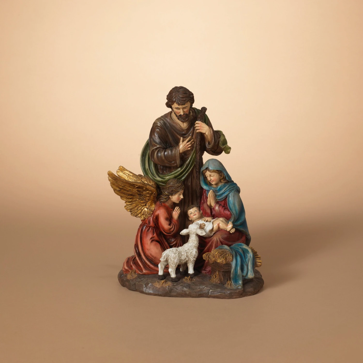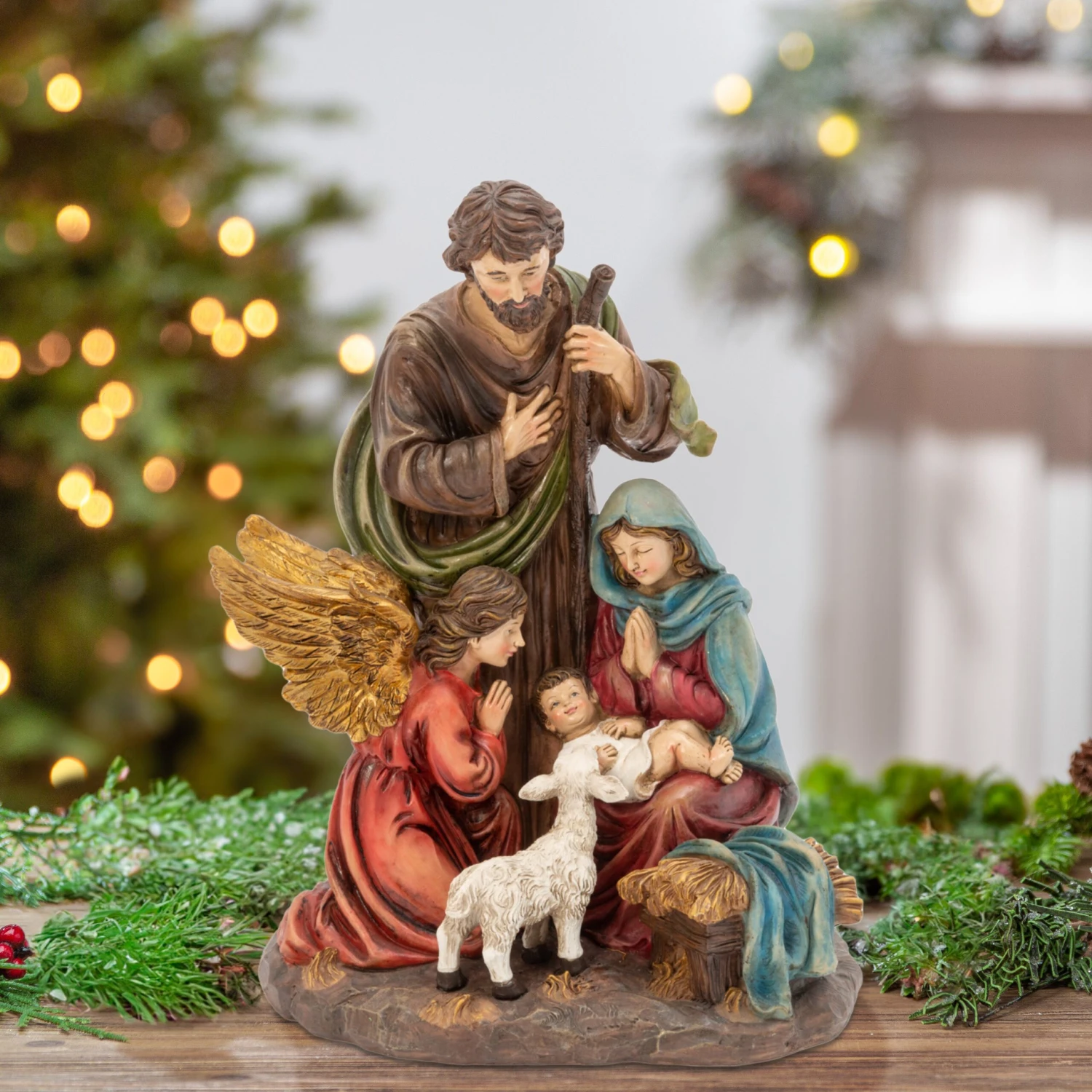 This beautiful traditional nativity scene is the perfect reminder of what the Christmas holiday season is all about. Parents Joseph and Mary look down full of love at a swaddled baby Jesus, held in his mother’s lap. A baby lamb and an angel kneeling with hands clasped in prayer gather around the family, eager to get a glimpse of their new king. With all the figurines dressed in rich warm colors with beautiful deep gold accents, this nine piece nativity set will blend in seamlessly with any decor style.